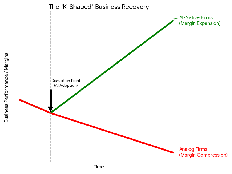 - The Lower K (The Analog): Companies that ignore AI see their margins squeezed by inflation and labor costs, unable to compete on price.