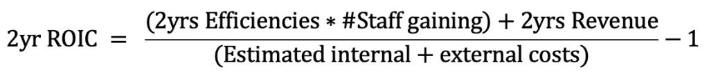 We calculate ROIC over a 2-year time-horizon in order to account for potential “ramp-up” realization of the benefits; we feel the 2-year horizon is more appropriate for the accelerating pace of change of the AI Revolution, but a more traditional 3-year analysis can certainly be used instead, per a client’s preference.