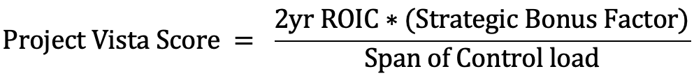 To move beyond subjective decision-making, Project Vista employs a quantitative formula to calculate a “Project Vista Score” for every proposed initiative. This score recommends a project’s rank for consideration by balancing financial returns against the practical limits of management: