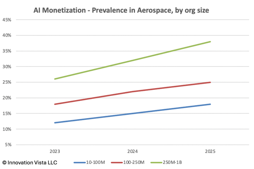 !nsights: AI is the most dynamic frontier for Aerospace. Stabilization rose from 44% in <$10M firms in 2023 to 60% in 2025, while optimization nearly doubled. Monetization, though still lower than in consumer-facing sectors, has grown significantly, from 7% to 25% in $100–$250M companies. Leading use cases include predictive maintenance, digital twins, and supply chain optimization, though Aerospace still trails Retail and Entertainment in embedding AI into customer-facing products.