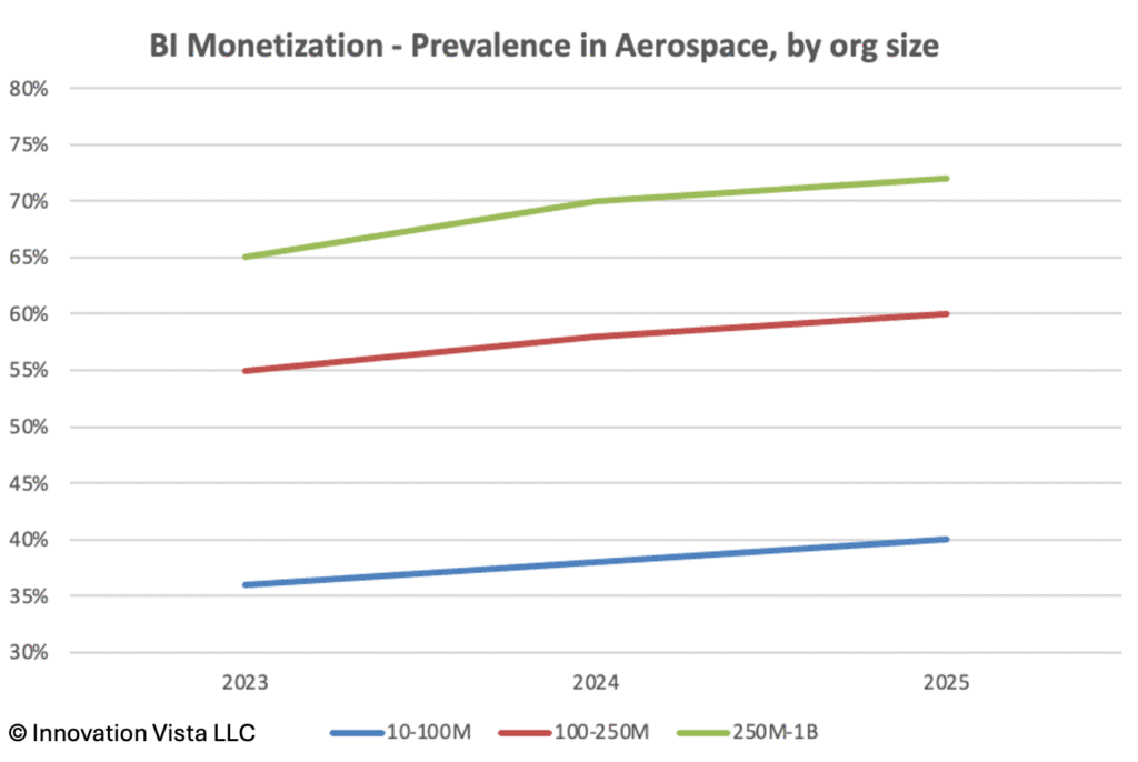 !nsights: Aerospace BI was highly stabilized by 2023, but monetization rates lagged behind leaders. This year, monetization climbs into the 40%+ range in mid-market bands and exceeds 70% in $250M–$1B companies. While not as fast-moving as sectors like Retail or Financial Services, Aerospace BI adoption is steady, supported by strong regulatory and operational reporting requirements.