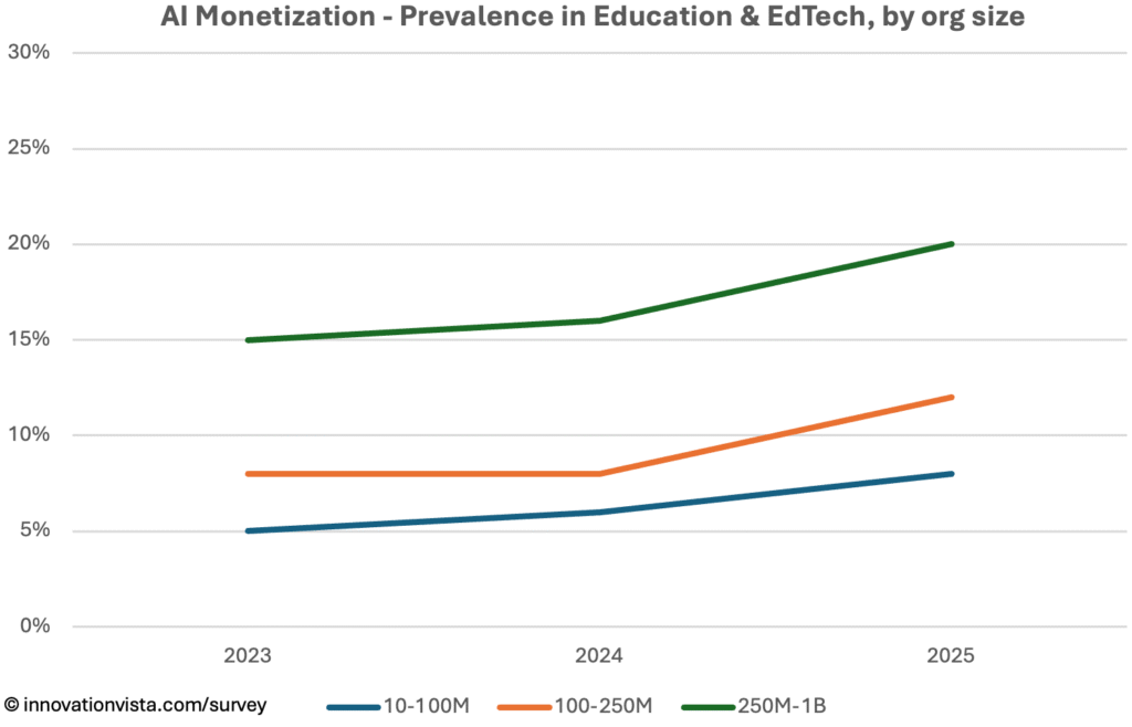 !nsights: AI is the weakest category in Education & EdTech. While pilots are growing — stabilization reached 45% in $10–$100M firms by 2025 — optimization is rare and monetization remains minimal. Even in $250M–$1B institutions, monetization is only 20%, far below the mid-market average of 35%. EdTech startups are the outliers driving progress, using AI for adaptive learning and content personalization, while most traditional institutions are still experimenting.
