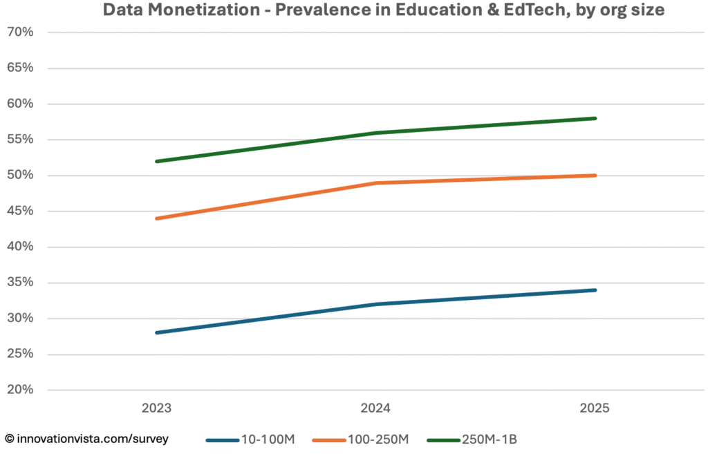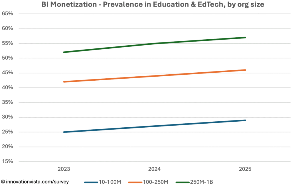 !nsights: BI is nearly universal in stabilization and increasingly optimized. But monetization is still limited, especially in smaller organizations: only 29% of $10–$100M firms monetize BI by 2025, compared to ~40–50% in other industries. Larger institutions and EdTech companies are leading the charge, embedding predictive analytics into student success dashboards and financial planning, but the long tail of smaller organizations is dragging down the sector average.