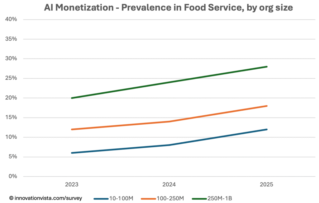 !nsights: AI remains the slowest-moving area for Agriculture & Food Service. Stabilization grows from 38% to 55% in $10–$100M firms over three years, showing more pilots and experimentation. Optimization improves, but monetization is still very limited—only 12% in $10–$100M companies by 2025. Larger firms perform better, monetizing at nearly 30% in $250M–$1B companies, but still trail the mid-market average of 35%.