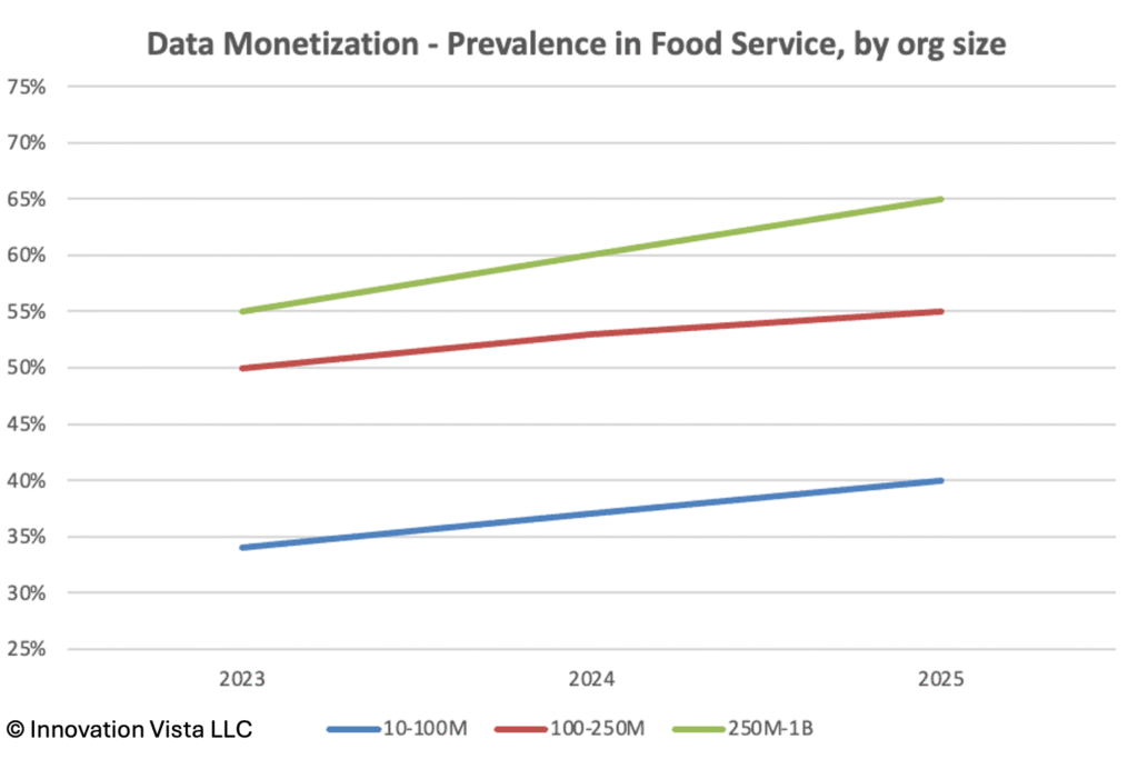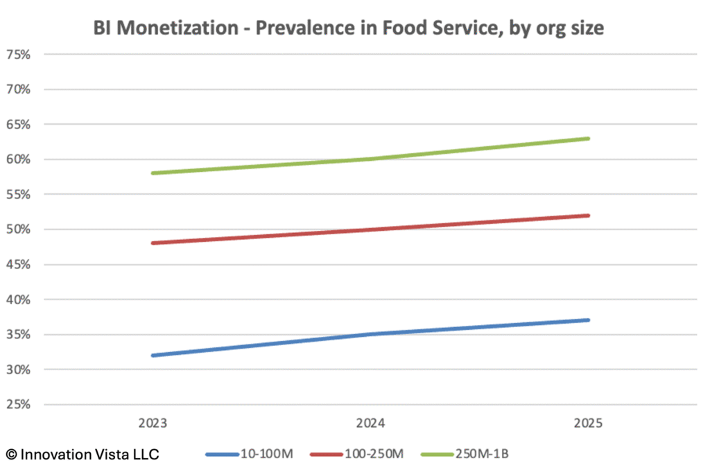 !nsights: BI adoption is strong, with stabilization nearly complete by 2023. Monetization, however, continues to trail the mid-market. By 2025, 37% of $10–$100M firms monetize BI, versus 42% across the mid-market. Larger firms are more competitive, with monetization rates exceeding 60% in $250M–$1B companies, but Agriculture & Food Service still trails leaders like Retail and Financial Services, where monetization is over 70%.