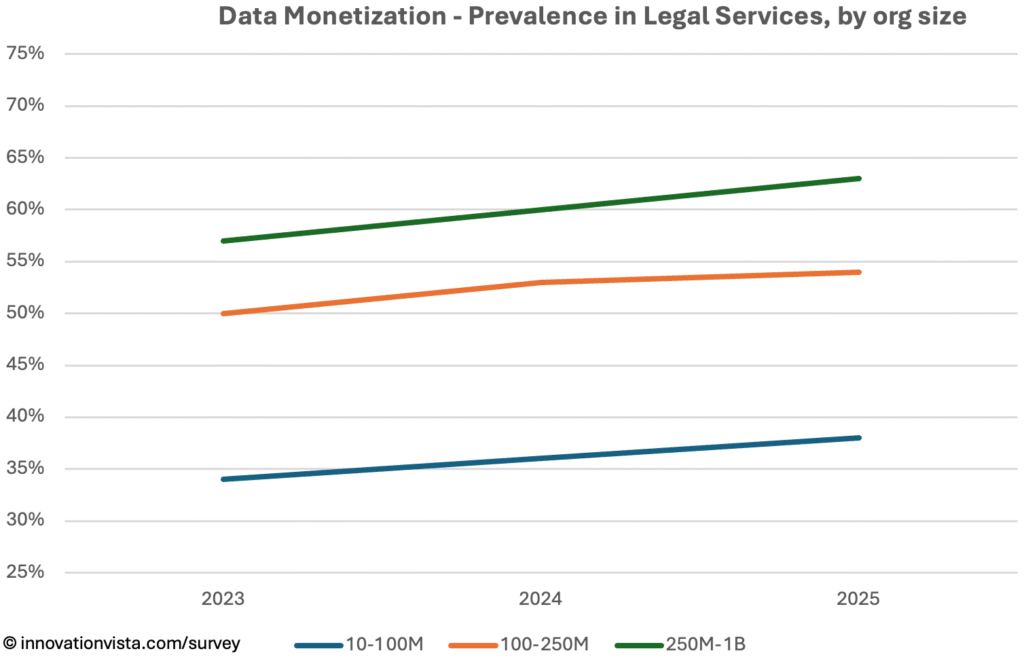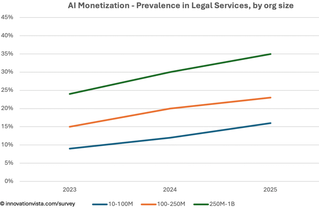 !nsights: Stabilization and optimization are strong in Legal Services by 2025, but monetization remains limited — just 38% in $10–$100M firms, compared to ~45% in the mid-market average. Larger firms are closing in on 65–70% monetization, with gains tied to document automation and compliance services.