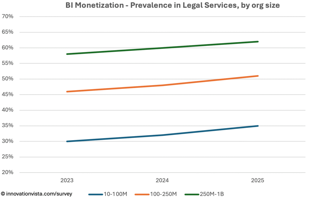 !nsights: By 2025, stabilization and optimization are nearly universal in Legal Services, but monetization is lagging. Just 35% of $10–$100M firms monetize BI, compared to 42% mid-market average. Larger firms are beginning to monetize BI through client-facing dashboards for case status, billing transparency, and predictive litigation outcomes, but the long tail of small firms still treats BI as an internal reporting tool.
