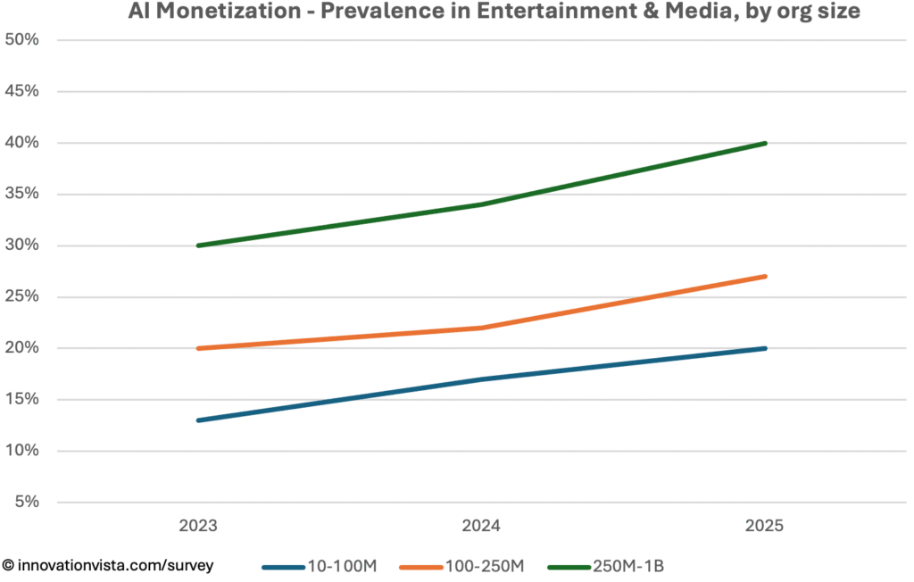 !nsights: AI is the most dynamic growth area. Stabilization is now nearly universal in the mid-market, with 47% of $10–$100M firms optimized and 20% monetized. Larger firms are much further ahead: monetization reaches 40% in $250M–$1B companies and 60% in $1B+ enterprises. The industry is leading in applying AI for recommendation engines, automated editing, content generation, and targeted advertising, all driving clear ROI outcomes.