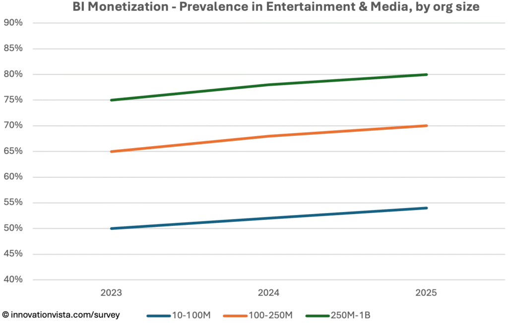 !nsights: BI is a clear strength in Entertainment & Media. Monetization sits at 54% in $10–$100M firms and climbs to 80–90% in larger companies, far above most industries. The sector demonstrates how BI can move beyond internal dashboards to power advertising pricing, content commissioning, and personalized user experiences.