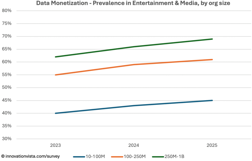 !nsights: Entertainment & Media firms are nearly universal in data stabilization and optimization by 2025. Monetization levels are high compared to the mid-market average – over 45% in $10–$100M companies and exceeding 70% in $1B+ enterprises. This reflects how the industry increasingly monetizes audience data, streaming consumption patterns, and advertising analytics.
