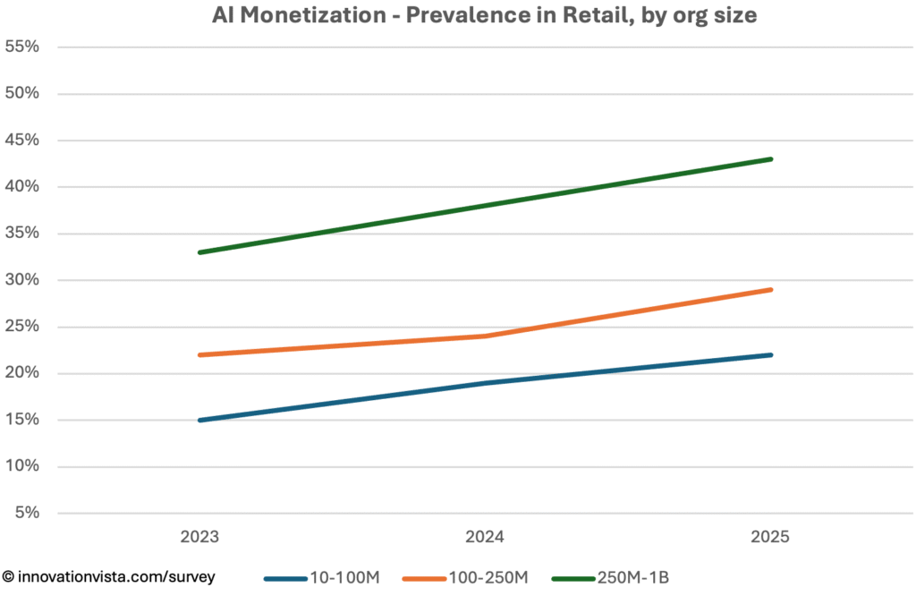 !nsights: AI is Retail’s clear differentiator. By 2025, 53% of $10–$100M firms have optimized AI and 22% monetize it, often through recommendation engines, personalized marketing, and dynamic pricing. Larger firms monetize heavily: 43% of $250M–$1B companies and 63% of $1B+ enterprises. Retail leads most other industries in AI monetization, proving that customer-facing personalization translates directly into ROI.