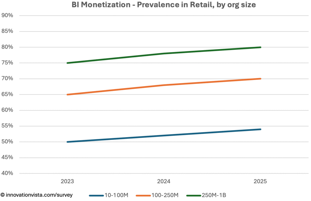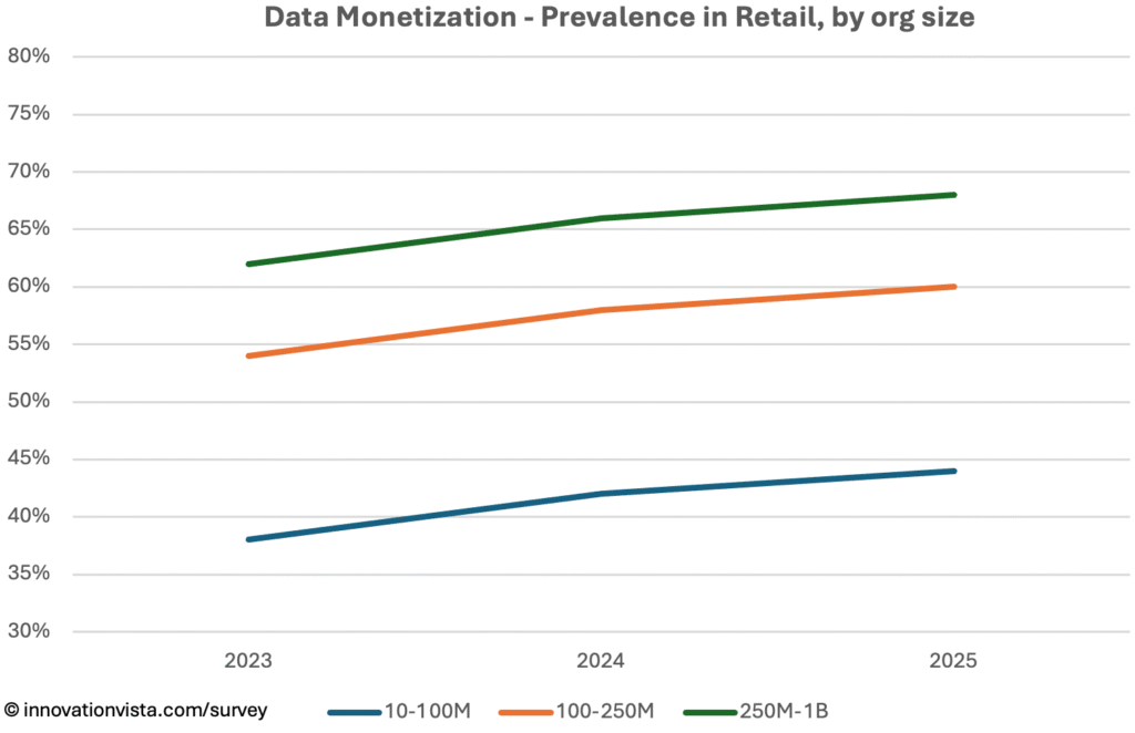 !nsights: Retail firms are universally stabilized and optimized by 2025, and monetization is strong: 44% of $10–$100M firms monetize data, while larger firms are above 60–70%. Data monetization is often tied to loyalty programs, customer insights, and supplier-funded analytics.