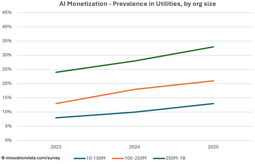!nsights: AI adoption in Utilities is advancing rapidly, particularly at larger scale. By 2025, 37% of $10–$100M firms have optimized AI pilots, though only 13% monetize. Larger firms are further ahead: 33% of $250M–$1B utilities monetize AI by embedding predictive grid management, asset optimization, and customer service chatbots into operations. The sector is moving toward using AI not just for internal efficiency but also to improve resilience and sustainability.