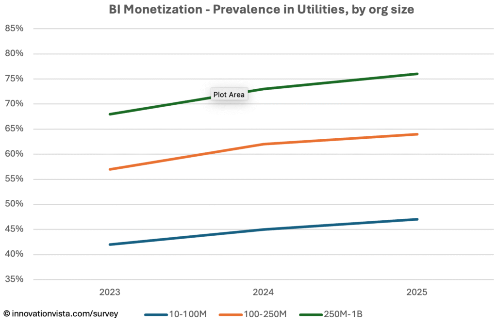 !nsights: BI maturity in Utilities is among the strongest of any sector. By 2025, monetization reaches 47% in $10–$100M firms and over 75% in larger mid-market companies. Predictive analytics for demand planning, outage forecasting, and regulatory compliance reporting are monetized both internally (operational efficiency) and externally (rate cases, customer-facing portals).