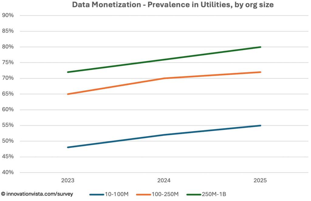 !nsights: Utilities demonstrate consistently high maturity across Data. Stabilization and optimization are universal by 2024, and monetization is climbing — 55% in $10–$100M companies by 2025 and 80% in $250M–$1B companies. Monetization comes through initiatives like smart meter analytics, predictive outage detection, and billing transparency tools that improve both efficiency and customer satisfaction.