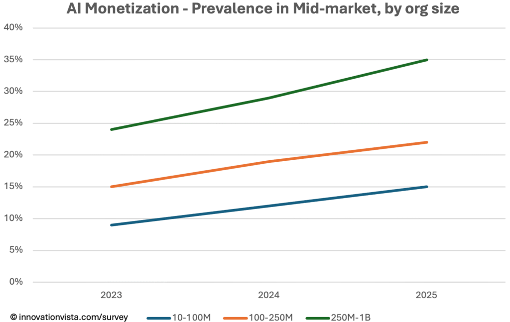 At $250M–$1B, monetization jumped from 29% in 2024 to 35% in 2025. While still early days, this level of growth signals that ROI from AI is becoming routine among scale players.