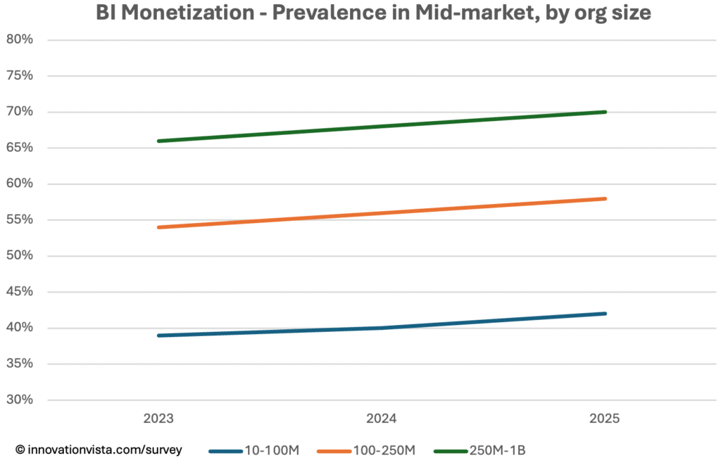 In $10–$100M firms, BI monetization climbed from 40% to 42%, and in $100–$250M firms from 56% to 58%. At $250M–$1B, monetization now sits at 70%, confirming that half of mid-market organizations have turned dashboards and KPIs into predictive, ROI-driving capabilities.