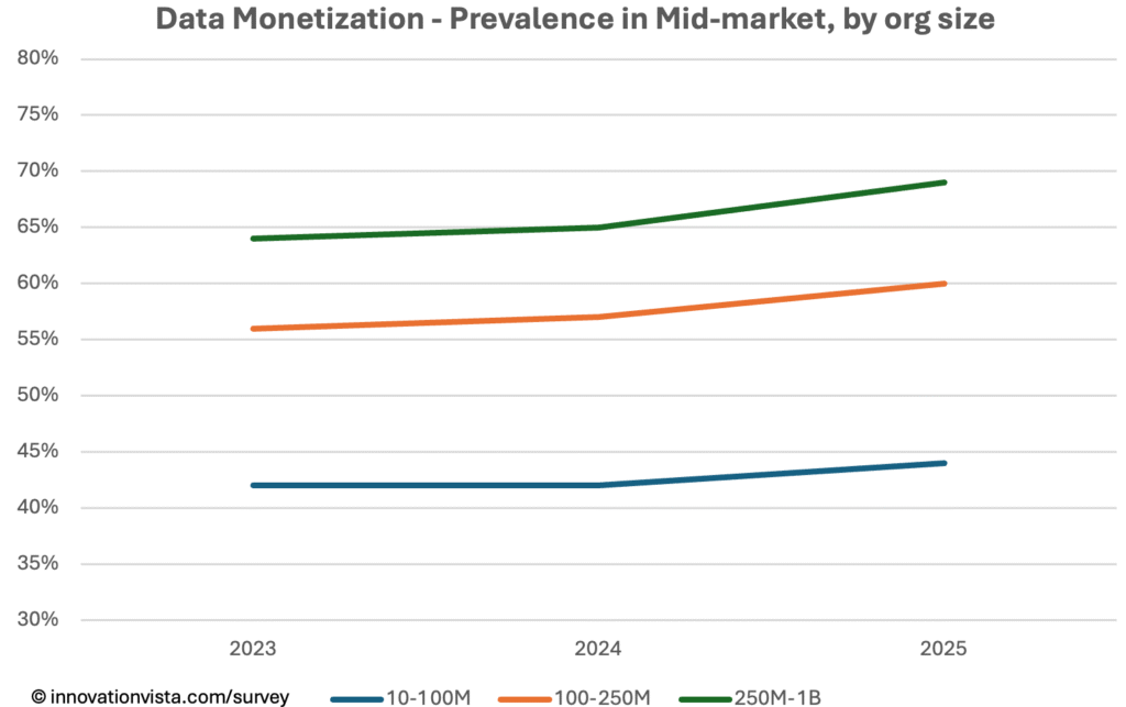 In the $10–$100M band, monetization rose from 42% in 2024 to 44% in 2025, while in $100–$250M firms it jumped from 57% to 60%. Across all mid-market tiers, the average now exceeds 50%, making ROI from data a new baseline expectation.